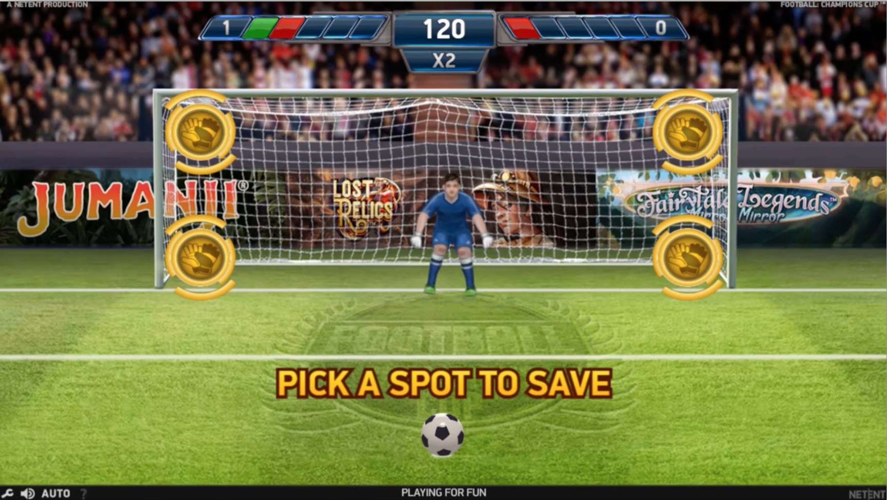 Let's start with a penalty bonus round, when you land at the main game three or more bonus symbols trigger. Then, into the penalty shootout, you act as both the recipient and the goalie for his team. Choose your scene, try to outwit the opposition and achieve a sufficient goal, won the penalty save and rack up some points along the way. Your destiny is in your own hands, if you can deal with nail biting tension!