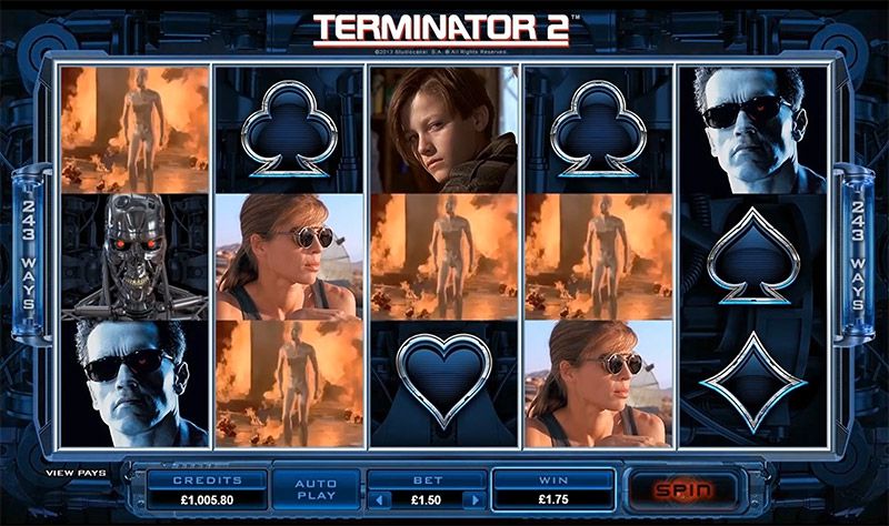 Terminator 2 package from the blockbuster movie, excellent animation and great music scene. Clubs, diamonds, hearts and spades - in the background, and electronics select the robot wires may be simultaneously in the reel, the four lower symbols and the start value card clothing can be seen