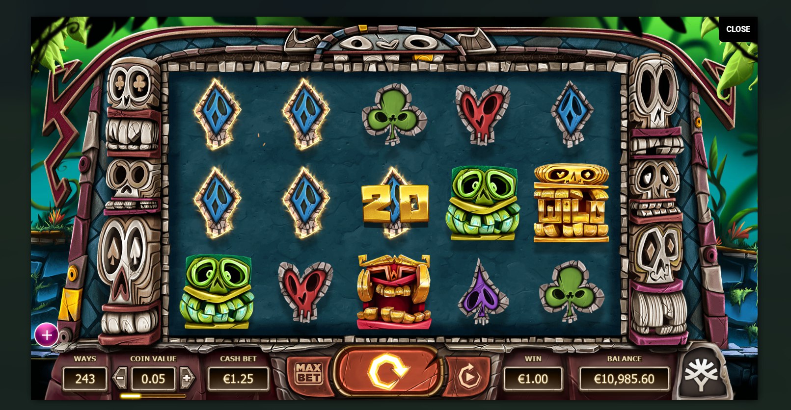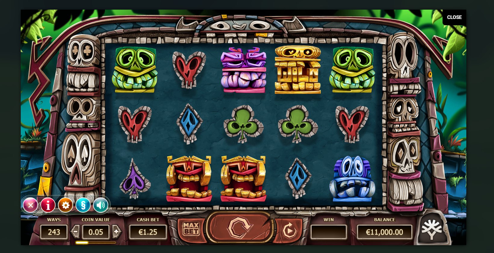 In terms of the 243 ways to win, there are no paylines as such with any combination of 3 or more subsequent symbols from left to right rewarding you with a win. The highest paying symbol is the red and yellow mask which rewards you with 400 times your line stake for 5 on a payline.