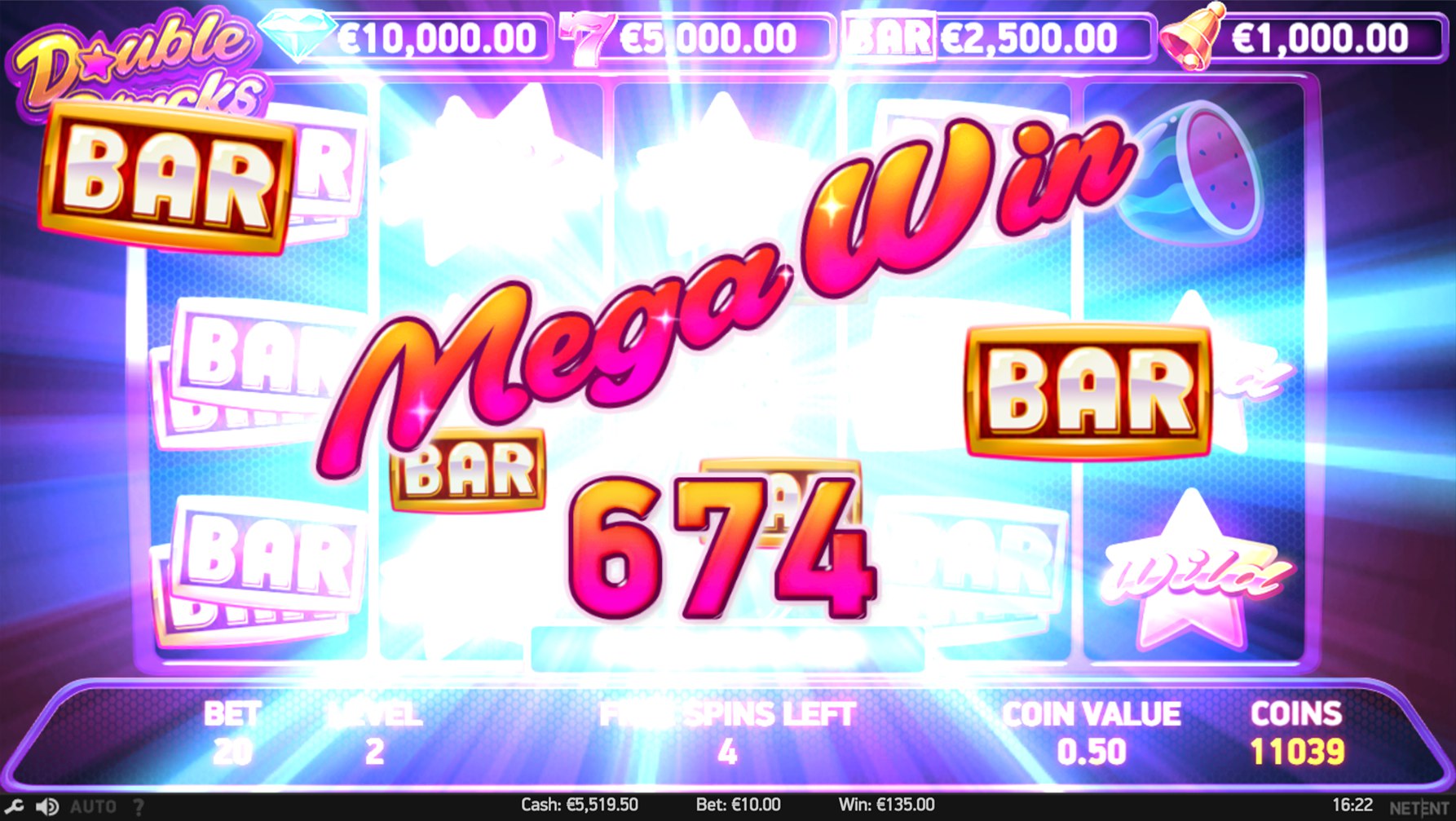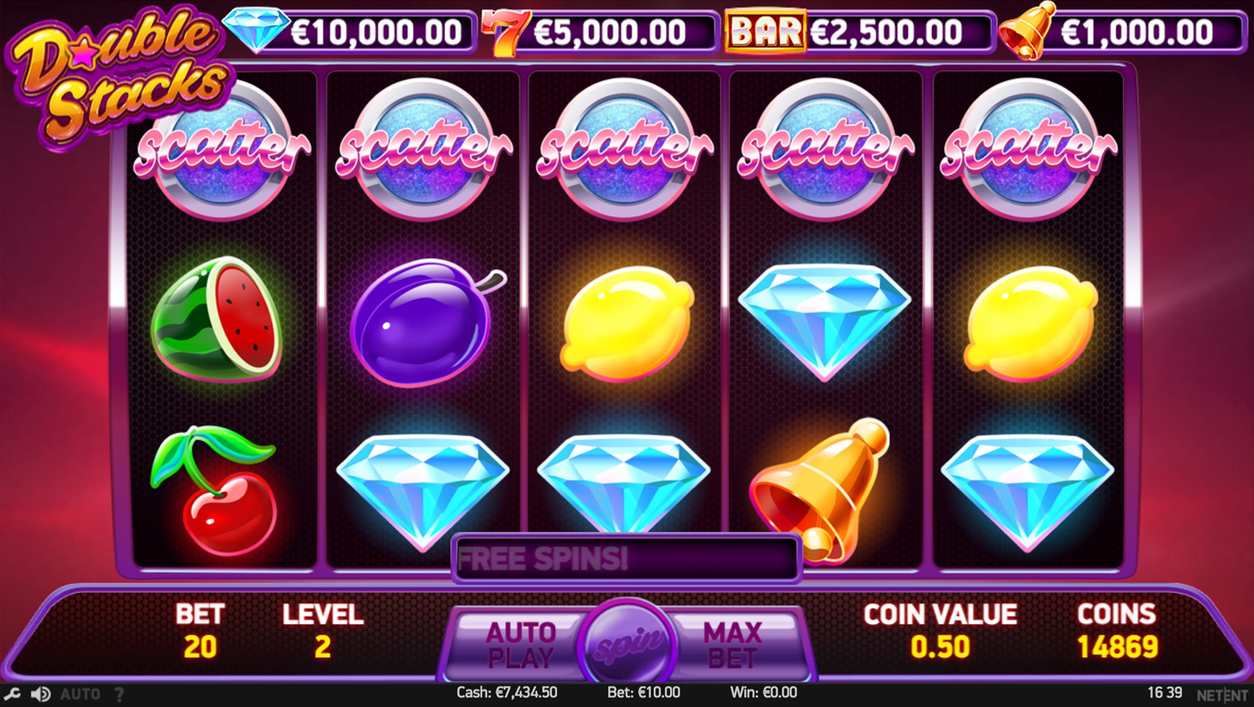 And what of the maximum win available on Double Stacks? On a single bet line, it can reach up to 10,000 coins – which translates to up to €20,000!